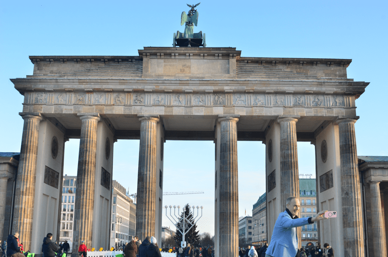 Hearing some of the truths of what the Nazis and USSR did to the city and its people is shocking and if truth be known, I felt quite emotional. Being an empath is a “bitch” on times. Plenty of things to see; not just architecture, the people, even the convoy of “Trabants” emitting the perfume of pre-Unification was noticeable especially since this odour was the only coming from the vehicles of the city. Passing through the Brandenburg Gate I spied a new piece of architecture. An installation in the form of an “Hanukkah menorah” with a “star of David” embellishing the central stem. All white – a sign of peace.