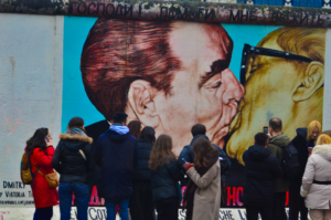 I awoke with a startle and observed the time, 9:05am. I muttered an expletive under my breathe for I knew we had planned an early start and I need an hour to come to my senses, caffeinate, and ablaut in the morning (notwithstanding nicotine). We entered the restaurant (food hall) hunting a table as the place was bouncing. Although only our second breakfast we Fishers had formed a silent ritual. Claire made for the coffee island and returned with juice and a cafetière of Jacob’s (Germany’s favourite coffee) whilst I raided the cold buffet. Armed with two plates of assorted rolls, bagels, cheeses, and meats, I returned to our table. I was shortly joined by Claire presenting the spoils from the hot buffet. American pancakes, scrambled eggs mixed with bacon, frankfurters and a boiled egg. There was no scrimping at the breakfast in a Radisson. I prepared a couple of rolls for take out in case we needed to dash for our tour of the east, before kicking into the hot food. Before my second coffee a gentleman caught my attention with “photograph!”. I scanned his face and immediately recognised him as a member of a group of Norwegians I had entertained at the Brandenburg Gate the day before. Asking me to take a group shot will never be point and shoot. I need to see happy faces and natural smiles. You entertain your subjects so they pose less and be natural the more. We exchanged pleasantries and wishes and he returned to his table, behind us. The world is smaller when you travel and differences diminish whilst friendships grow. Within a matter of minutes his wife approached. My guess was her English was better than her spouse. Again a short exchange of wishes and smiles, before returning to our collective feasting. Sufficiently fed and watered we crossed the busy road to the bus stop to meet the bus for the Blue route. Red is the very popular western route, whilst the eastern route is a lesser circuit. Meeting our driver was an experience. He could not have been more helpful, pleasant, courteous, and selfless. Assisting me onto the bus and ensuring I was comfortable. We began our journey with the piped commentary beginning with a chorus from “The Winds of Change” by the Skorpions. Our trio of presenters re-introduced themselves and began to explain the history of east Berlin. How the west side had the input and backing of the western allies and notably American cash in the 50s whilst the backrupt USSR took from the former East Germany. We past examples of Soviet architecture where various demonstrations to the plight of the overworked proletariat was met with Russian tanks. Eventually we came to a remnant of the Wall covered in murals. An open air gallery with some quite famous images. One such depicts Brezhnev and Honecker entwined in a kiss on the lips. This was explained as a traditional way of greeting in the USSR. I however, remember it as being a symbol of how the former East German government was ‘in bed with Moscow’. We were allowed a ten minute lay over and whilst Claire went off to get some shots I stepped out for a vape. I soon was joined by the driver who insisted in getting my rollator so I could sit in comfort. I initiated a conversation with him. I learned though German his parents came from two very different cultures. His father was Iranian and had escaped after the fall of American back Shah in the late 70s whilst his mother was German. We chatted about how cosmopolitan Berlin is and how extremism in any form inhibits our development. Back on the bus we entered the techno club district where parties begin on Friday night and end at 9am Monday. Berliners know how to party. We also enjoyed the Caribbean market and the clubs dedicated to reggae. We soon were back to where we started. I was fulfilled with history and culture. Getting a sense that “anything goes” in Berlin, providing it is lawful. I bid our driver goodbye with a hearty handshake and small tip to express our appreciation of his good humour and manners.