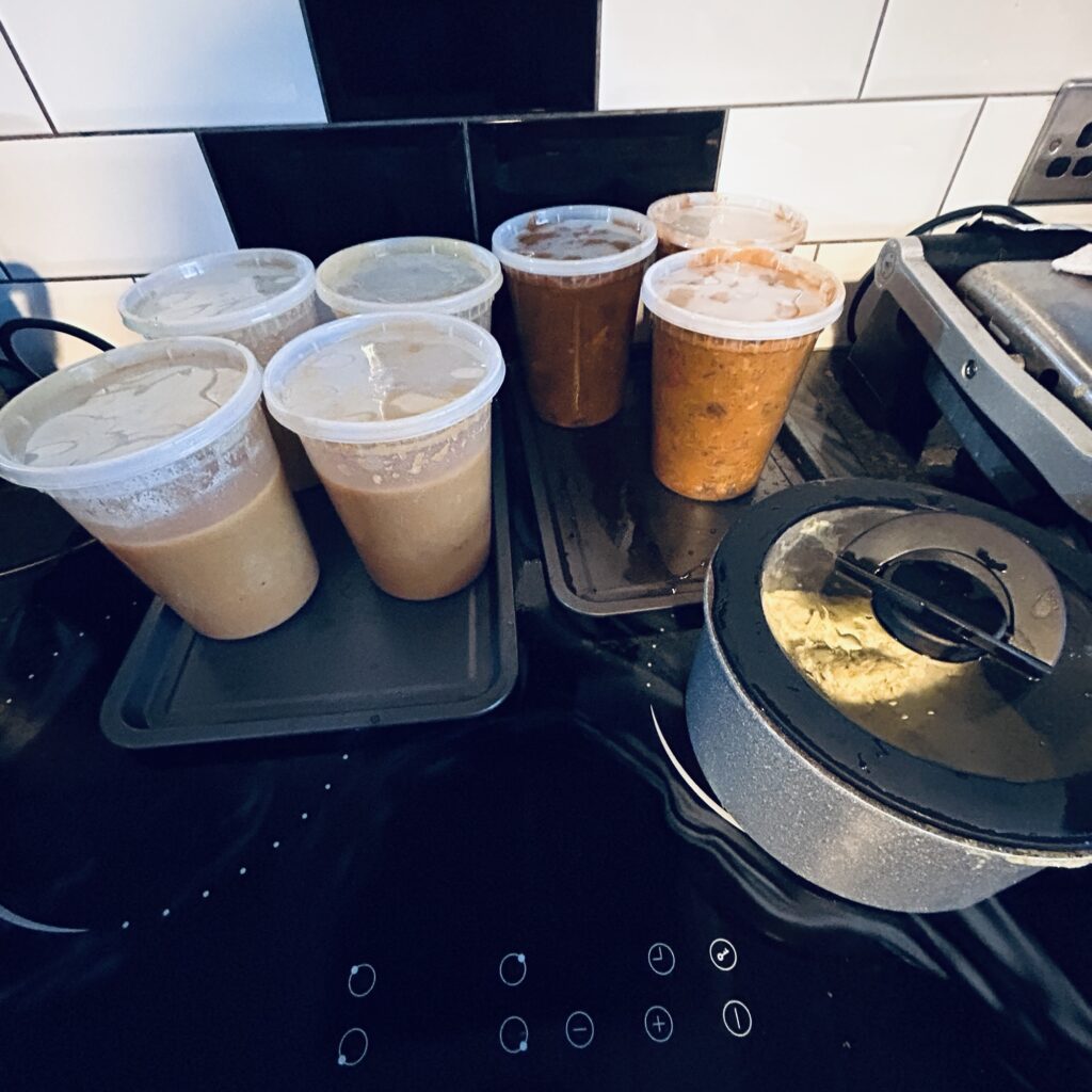 Inspired by the urban legend of the Turkey Curry, I made a scratch Chicken dopiaza with a tomato base. I’m not sure if sprouts from Brussels are an authentic ingredient but in they went. Fresh curry for supper with another 6 portions (serves 2 x3).